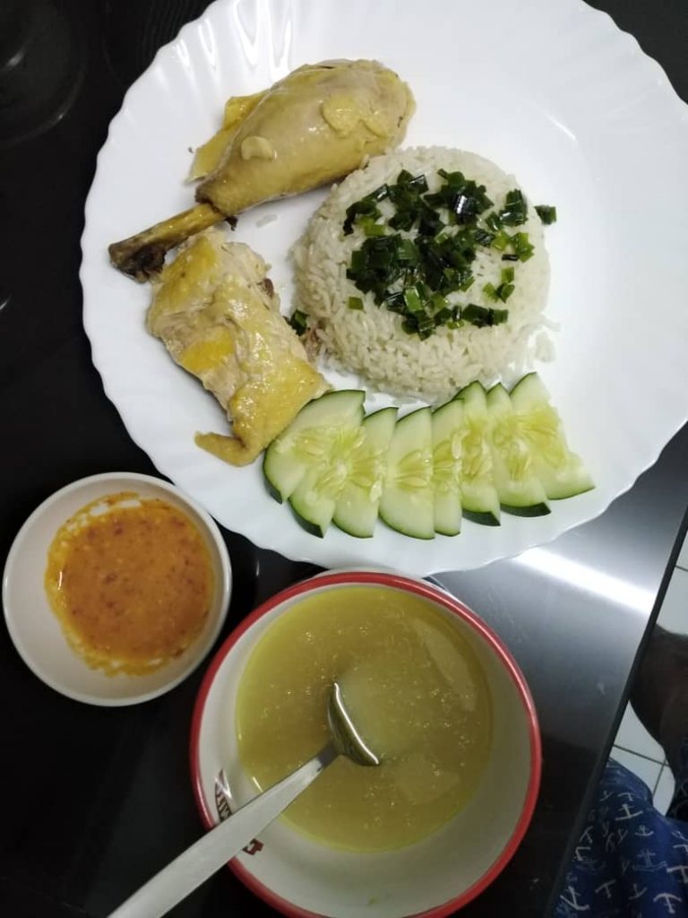 Water for steaming – 2 cups – if you like more soup then add more water. You will need to add extra water when steaming the chicken because the remaining water after steaming will be used for cooking the rice. Reserve some of the remaining soup to eat with the chicken rice.